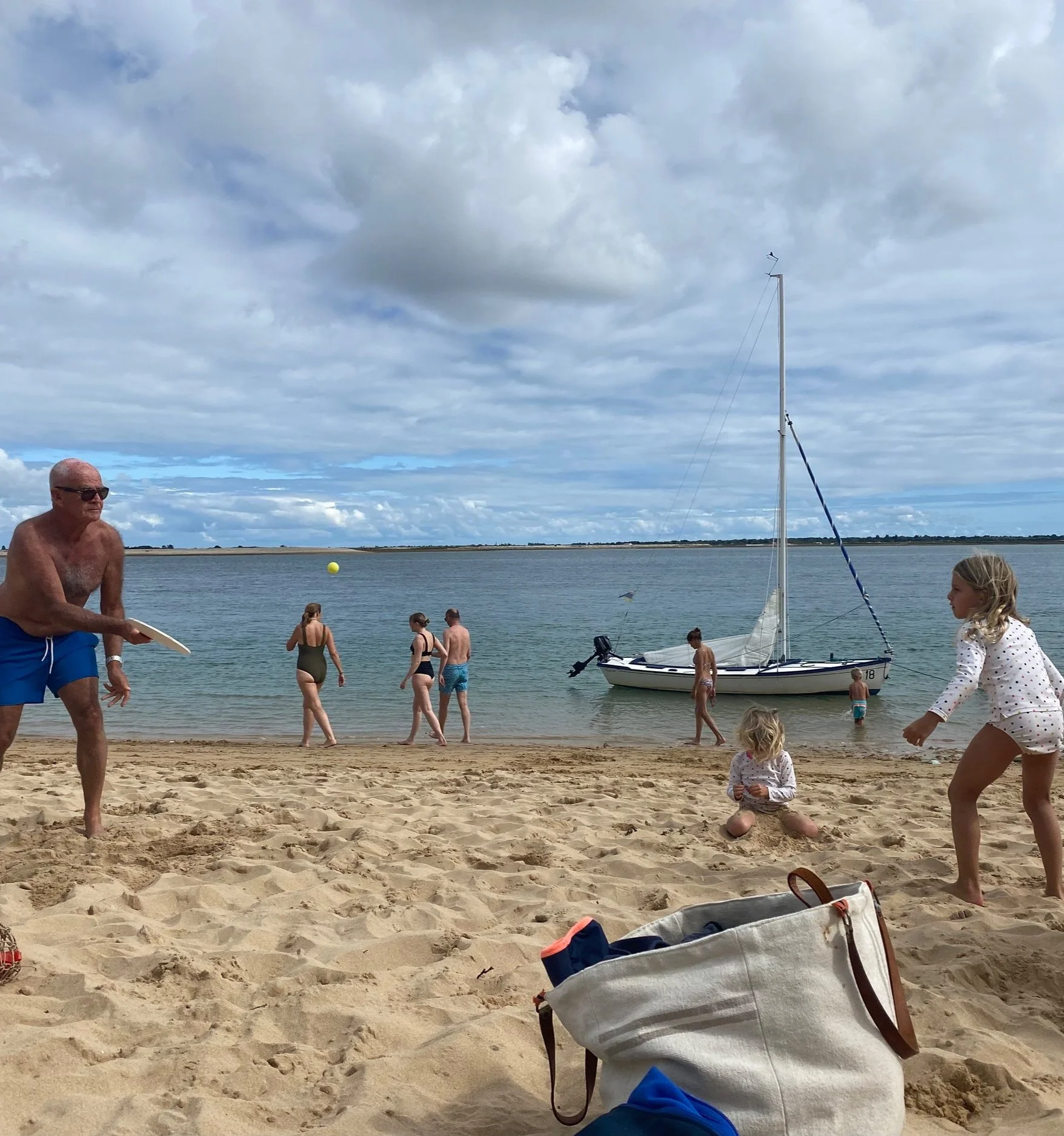 We quickly drive to Ars where we start all over again! Friends: Sophie & Philippe C., Laurence & François L., Odile & Bernard T., yummy picnics, beach, sailing, nature… A visit from Caroline & Hervé L. Plus a little job from François L. to Pierre…